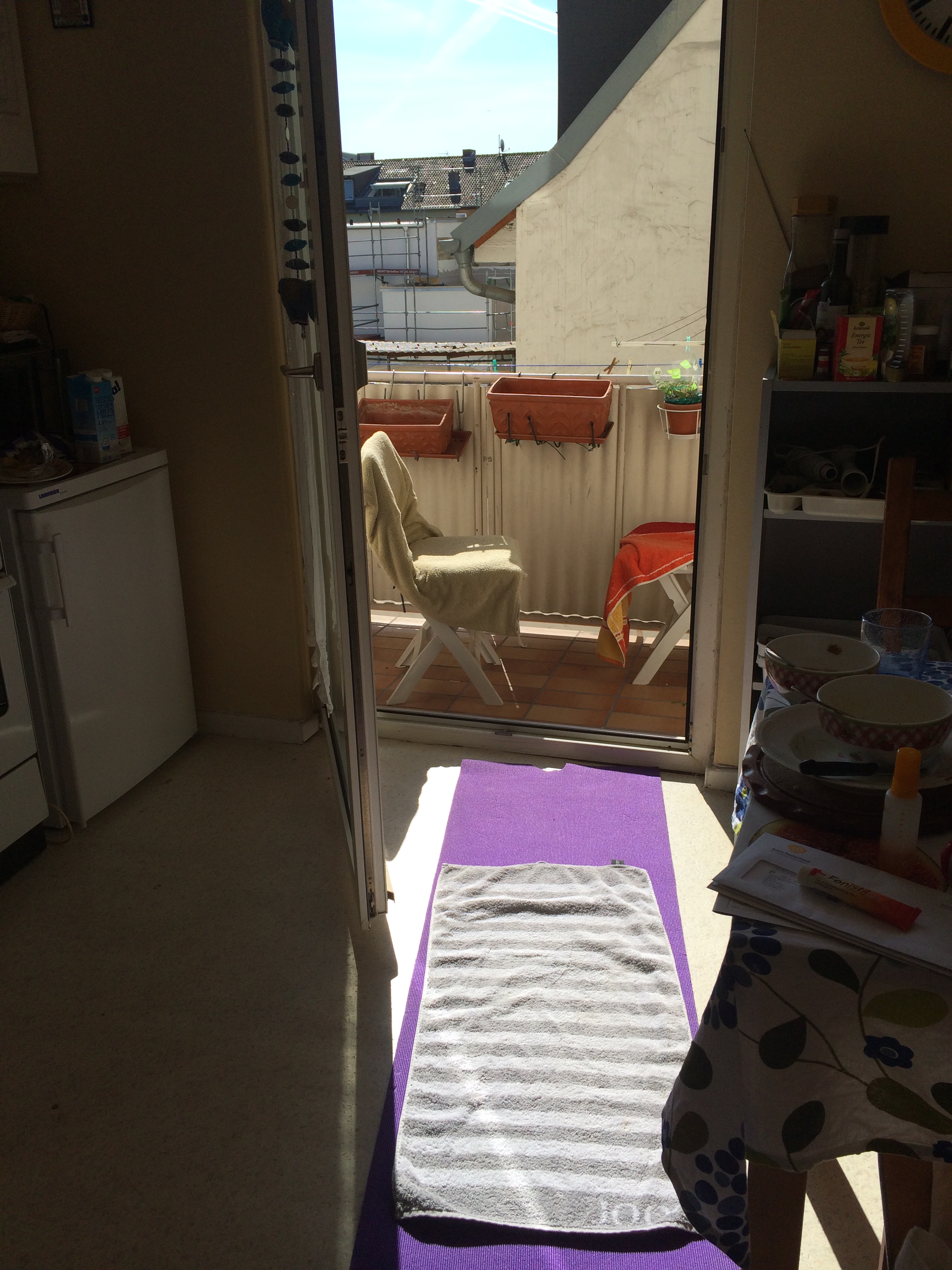 Weil der Balkon zu klein zum Hinlegen ist und die nächste grüne Wiese unerreichbar, wird improvisiert. Oh, ein 2x 1m Lichtkegel in Küche. Damit kann ich arbeiten! 😀