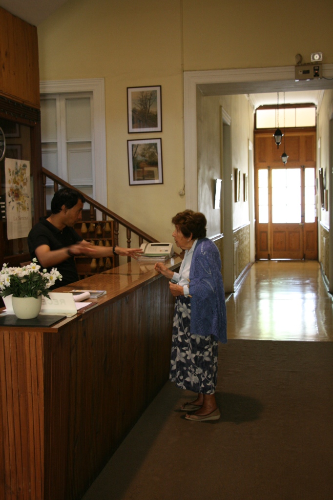 Kommen wir an… richtig runtergekommene Stadt, desaströse Straße, total im Hafengebiet gelandet. 😀 Die Konklusion: Erstmal schön am Hostel vorbeifahren und unsere Busfahrt nach Bariloche am Terminal einen Tag vorverlegen. Und das klappt sogar verrückter Weise. Heisst, wir müssen das Auto morgen früh abgeben. Allerdings geht der Bus auch schon um 10.45h. Und da ist ja auch noch dieser Steinschlag. Heiße Kiste 😀 Um zu fragen, wann hertz aufmacht, versucht eine Frau im kleinsten Café der Welt – aber hauptsache offizielle Telefonanlaufstelle im Terminal xD – für mich anzurufen. Ocupado – besetzt. Noch mal anrufen will sie partout nicht. Hm, na gut. Dann schnell zum Hostel und von da anrufen. Nach der endlosen Treppe, die wir wegen unseres Muskelkaters kaum überwinden können, werden wir mit offenen Armen empfangen. Johnny hat uns wohl mit netten Worten angekündigt. Total nettes Ehepaar, 2 DZ zum Dormpreis, top Küche – sogar parken können wir im privaten Garagenhof. Auch von hier aus versuchen wir bei hertz anzurufen. Nach 3 Nummern und 10 Versuchen bekommt Alejandro jemanden ans Telefon. Anstatt nur die Öffnungszeit zu erfragen, meint er es gut und macht für uns den super service Ablauf klar. Es kommt nämlich raus: damit die Versicherung greift, müssen wir mit unserem mini Steinschlag noch zur Polizei. Zur Erinnerung: Unser Bus nach Argentinien fährt um