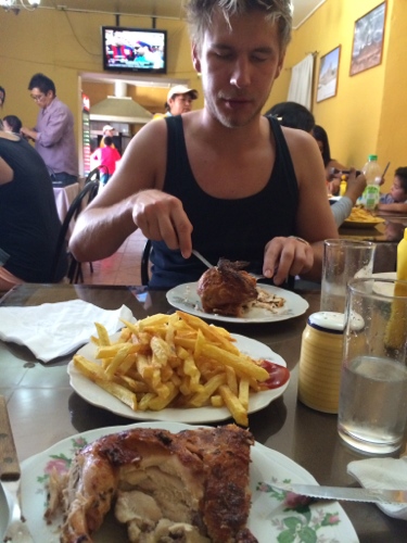 Zurück in San Pedro haben wir nach all den Abenteuern und der Anstrengung hunger. Aber wie. Wie gut, dass Mathi und Rici einen Hähnchen-Imbiss erspähen, in dem nur Einheimische sitzen. Brechend voll, alles besetzt, bis auf einen einzigen 4er tisch. Natürlich, wie immer geht für uns alles glatt. Das knusprigste und zugleich zarteste Brathähnchen sowie die riesigste Portion Pommes meiner fast 25 Jahre Fress-Laufbahn liegt vor mir. Welch göttliche Kombi xD Oben drauf gibt es noch eine selten schöne Sprite Flasche, von der Mathias noch lange Zeit schwärmen soll. Die war aber auch schön, du 😀