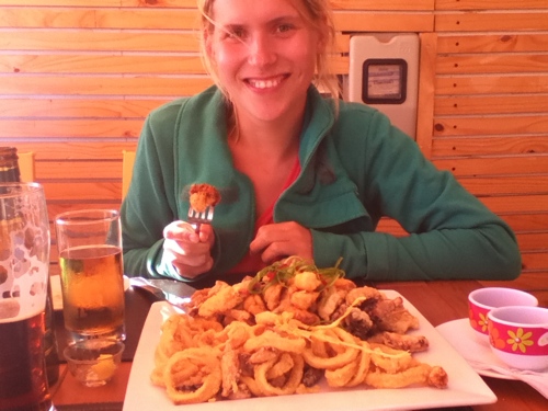 Endspurt. Wir sind am Ort, finden sogar ein Schild zum Strand. Da ist er, ab auf den Parkplatz zu den anderen Autos. Wums, wir stehen. Was ist los? Ja sichi xD Wir stecken auf dem dritten Meter im Sand fest xD Das gibt’s doch jetzt nicht. Mathi ans Steuer, wir drei graben, bauen eine Rampe aus rumfliegender Pappe und schieben. Wuay geschafft, wir sind auf dem festen Stück und können die letzten 50m zum Strand machen. Ohne mich xD Ich renne hinter den nächsten Busch, der 30 cm hoch ist. Egal, ich bin wieder aufnahmefähig. Das feiern wir an einer der coolen Strandbars mit einem Bier – und einem riesigen Meeresfrüchteteller. Joa, mit Ansage rächt sich das natürlich bei Thomy und mir noch mit der absoluten Flitzekacke xD Zu unserer Verteidigung: Als wir den Teller am Tisch weiter entdeckt haben, dachten wir, der Berg Calamaris seien Pommes.. 😀 😀 Bereut wird trotzdem nix. Lecker war’s. Richtig gut war auch Ricis und Mathis Bestellumg: N Salat sollte es sein. Erst musste Rici Mathias ewig überzeugen, dass der auch ohne Hähnchen ganz lecker sei. Dann trug Mathi minutenlang einen Kampf mit sich aus, ob er denn noch Pommes dazu bestellen sollte. Am Ende blieb’s bei dem Salat. Und als der serviert wurde, hättet ihr Ricis Gesichts- Starre sehen sollen. Das war alles mögliche, aber kein Salat in unserem Sinne 😀 Ganz vorsichtig fragt der Kellner, ob alles ok sei. Rici sagt mal einfach ja und probiert. Der Kellner bleibt sicherhaltshalber mal noch ein bisschen stehen und fragt dezent nach, ob sie sich da ganz sicher sei xD Aber schmeckte wohl tatsächlich. Was es auch immer war.