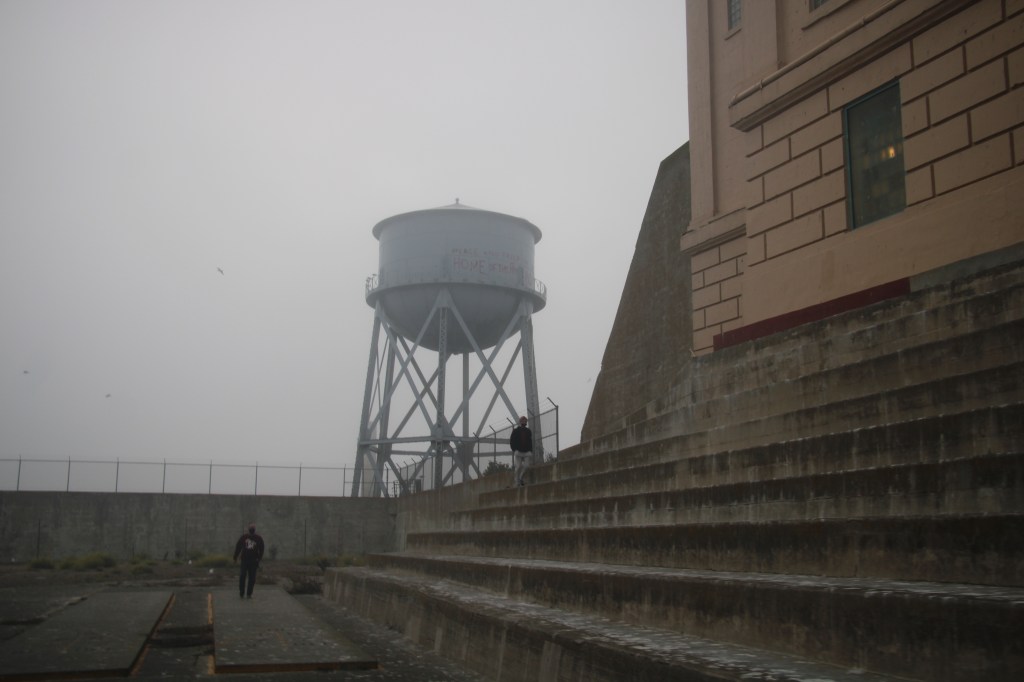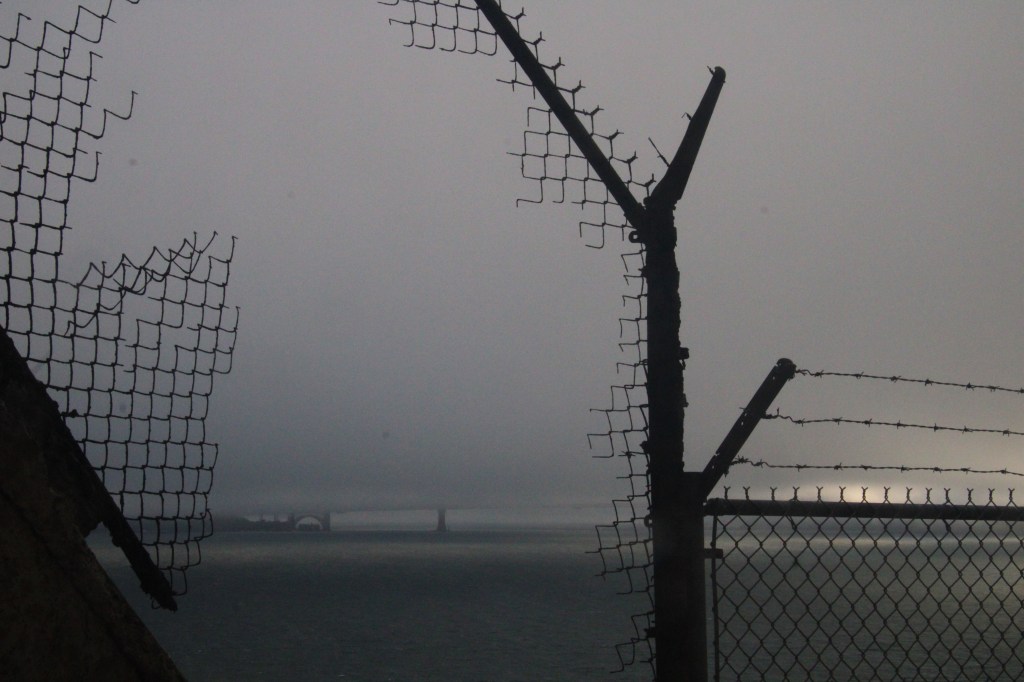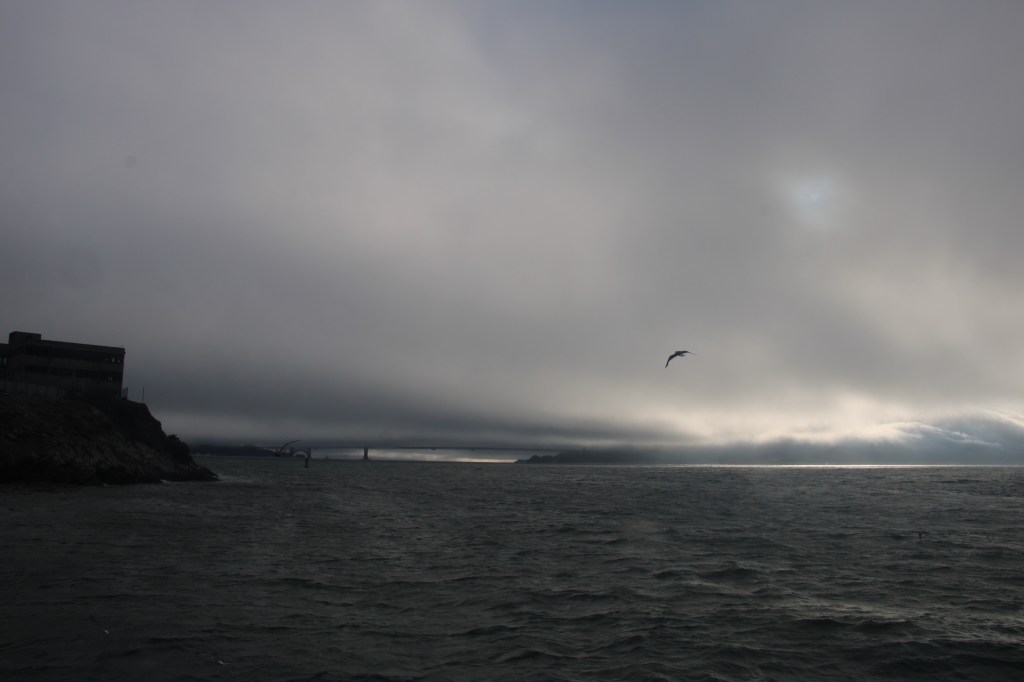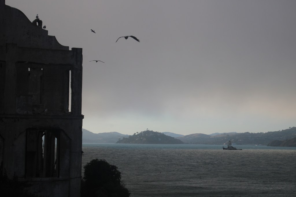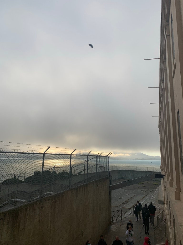 Und ich kann es nicht beschreiben, aber dieses Gefängnis und diese Insel haben eine so krasse, traurige Aura. Hier rumzulaufen fühlt sich an, als wäre der Ort verflucht oder so. Die Türme, die aus dem Nebel ragen. Die Vögel, die alles umkreisen. Der Kontrast zwischen deinem grauen, nebelverhangenem Knast und der hell strahlenden Skyline von San Francisco. Unbeschreiblich.