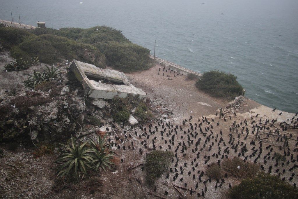 Vor 15 Min noch Sonnenschein gehabt, folgt der Nebel der Regieanweisung und hüllt die Insel ins richtige Setting. Die Wellen preschen vom Wind gegen unser Boot und über dem grauen Himmel der Insel kreisen hunderte kreischende Pelikane um den alten Leuchtturm. Gänsehaut pur!